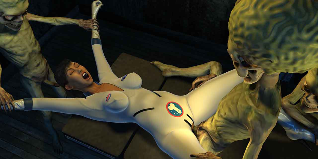 Skinny, but extremely well-hung, green creatures has captured a futuristic women from her spaceship and now they are trying to figure out how to fuck her the best.